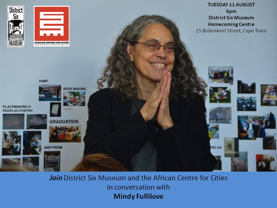 It is with great pleasure that the District Six Museum and the African Centre for Cities invite you to meet Dr Mindy Thompson Fullilove, visiting from Columbia University in New York. Dr Fullilove is a professor of Clinical Psychology and Public Health, and is interested in the links between the environment and mental health. She has researched, written and designed projects which speak to this concern, and is well-known for her critique as well as the development of various initiatives in New York and surrounding neighbourhoods.