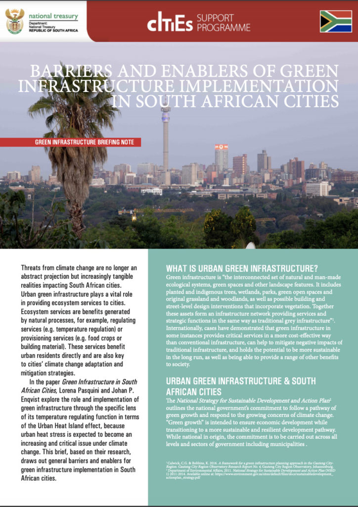 Urban green infrastructure plays a vital role in providing ecosystem services to cities. These services benefit urban residents directly but are also key to cities’ adaptation and mitigation strategies, given the increase of climate change-related risks within cities. It is therefore critical for local governments to consider green infrastructure solutions, especially ones that can cater to the urgent need for housing and development while still preserving functioning ecosystems in the urban landscapes. This report, by Lorena Pasquini and Johan P. Enqvist, examines the barriers and enablers to the implementation of green infrastructure, specifically focusing on the issue of temperature regulation in South African cities. Drawing on published literature and case studies from three metropolitan municipalities – Mangaung, City of Cape Town, and City of Johannesburg – the report aims to help fill an important policy and practice gap, and provide direction for cities to consider the issue of temperature regulation proactively.