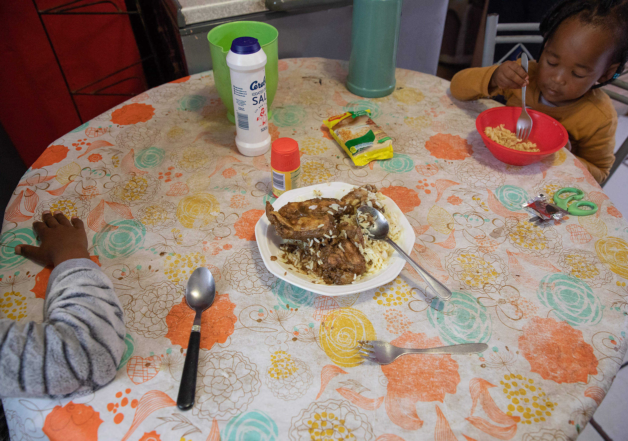 “This is a lunch time meal in Zweletemba. For lunch the adults and older children normally ate leftovers from the previous night. The younger kids usually had two minute noodles – preferred by the kids and cheap and accessible for the family. The older kids help the younger kid by preparing the noodles. The salt and Aromat were used on both the leftovers and the noodles.”