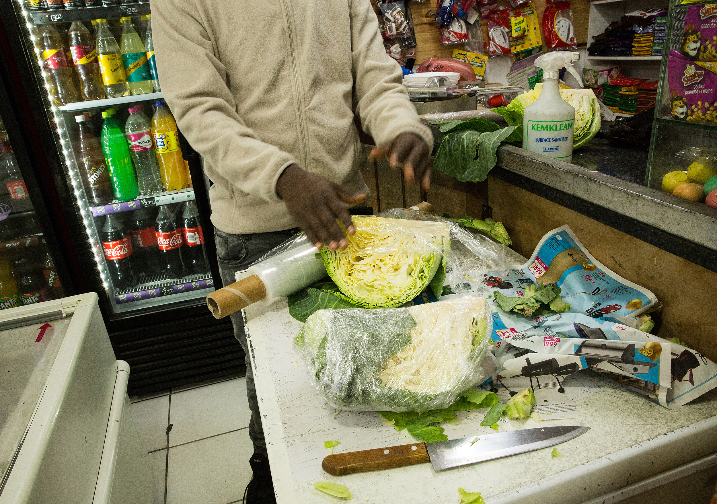 Participant 1: “Good morning, what I can induce from this picture is that there isn’t any proper hygiene processing. The cabbage is being cut on top of a newspaper. Even the person that’s preparing this isn’t wearing any gloves and I’m certain his hands haven’t been washed. This is typically why I don’t buy and ready/handled food at Baraka stores (foreign owned spaza stores) because they don’t care much about cleanliness.” Participant 2: “Ever since the Barakas came into Masiphumelele, they have far played a crucial role in our community (though people or “we” get sceptical of their products because they are low in the production level. Usually cheaper and unusual products we have never been exposed to… They give food in credit, as in the picture they make things easier by creating halves for lower prices. Half of loaf of bread, half of the cabbage, single nappies for R4/R5, slices of polony or cheese at a lower price, beef stock cube for R1. The cheap nappies (brands we don’t know but very affordable and user friendly). A packet of 20 for R40. The 10kg combos, rice, sugar, mealie meal, flour.”